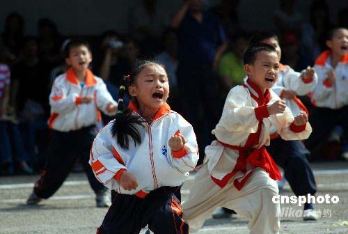 5月8日,广西柳州市箭盘山小学举行迎奥运趣味运动会,1600多名小学生与家长一道,参加火线抢水、福娃拼图、水中捞鱼等10多个趣味项目的比赛。中新社发 小木木 摄