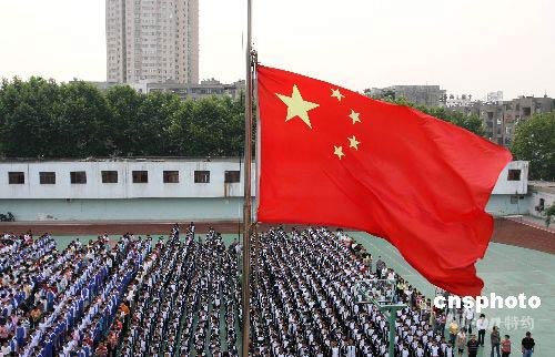 5月19日清晨,湖北襄樊31中降半旗,哀悼“5·12”汶川大地震中的遇难同胞。中新社发 余翔 摄