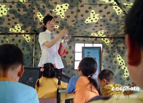 5月26日上午,志愿者杨棣茹在帐篷里为灾区小朋友介绍有关飞机的科普知识。杨棣茹是广汉中国民航飞行学院2005级大学生,“5.12”地震后,她报名参加了志愿者,成为救助中心的“老师”。在地震灾区活跃着无数象她一样的青年志愿者。中新社发 张钰昱 摄