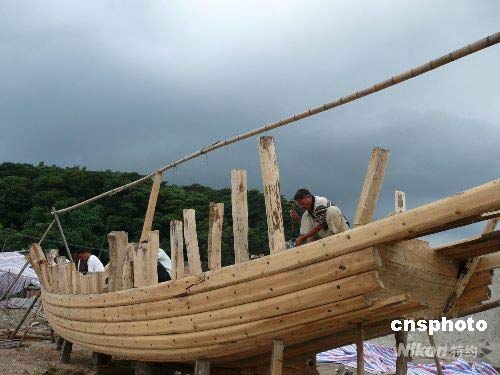 在福建宁德市漳湾码头附近,有一建造“福船”的工棚,数十位工人按照各自的分工,有条不紊地进行着劈木、铆弦、上油……据这里的一位刘姓老师傅介绍,他们的先祖是从泉州晋江一带迁移到这边的,带来了建造“福船”的技术,到现在已经有二百多年的历史。