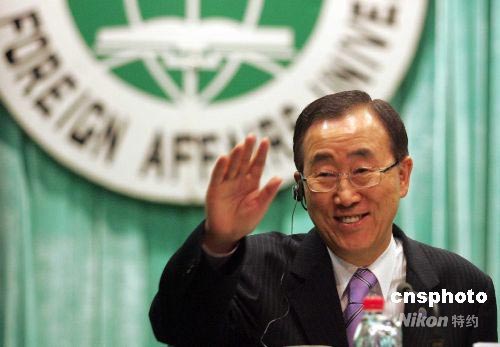 7月1日下午,联合国秘书长潘基文抵达北京,开始对中国进行为期3天的正式访问。图为潘基文在外交学院发表演讲。中新社发 张宇 摄