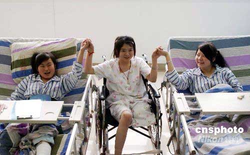 7月2日,三名四川绵竹东汽中学的考生在重庆新桥医院熟悉考场。3日,她们将在重庆参加高考四川延考区的考试。三位同学中有两位腰、腿有伤,另一名同学高位截肢,她们将在病床、轮椅上答题。中新社发 曾理 摄