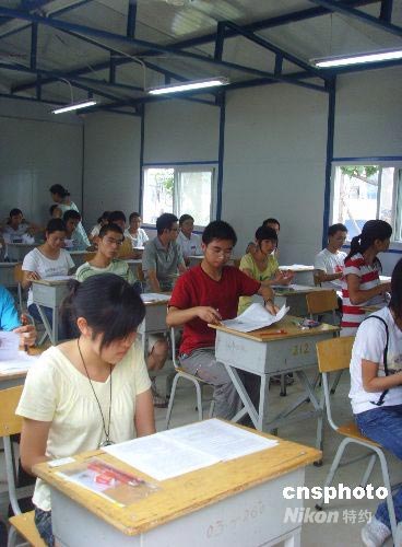 7月3日,四川地震灾区9万余名高三学生参加迟来的高考,图为绵竹考点的学生在四川省工程职业技术学院新建的板房内参加高考。中新社发 霍潺 摄