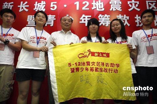7月6日,中国扶贫基金会“新长城5.12地震灾区寻访助学暨青少年筹款挑战行动”在北京举行。活动招募青少年志愿者组成筹款团队,每队3人用时2周挑战筹款,目标1万元人民币,善款将作为新长城自强助学金用于5.12地震灾区小学学生的生活学习费用。本次活动的主题为“直面灾难,共同成长”,一方面通过活动筹集善款为灾区学生解决经济困难,另一方面,城市里的青少年通过这次活动得到了一次难得的奉献爱心,挑战自我的机会。此次活动的分为网上报名()和现场报名(010-62639775)两种,截止于7月12日。图为中国扶贫基金会会长段应碧(左三)为首批志愿者团队授旗。中新社发 杜洋 摄