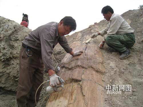玉门市国土资源局技术人员正在对该市硅化木地质公园内裸露在地表的硅化木喷涂防护漆,防止硅化木继续受到风雨侵蚀。作者:白明端