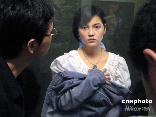 7月9日,北京观众在中国美术馆举办的“2008·第三届中国北京国际美术双年展”详细观看画家冷军一幅《肖像--小唐》作品。此次展览有来自81个国家的747件当代绘画和雕塑作品共同展出,持续到8月12日。 中新社发 邹宪 摄