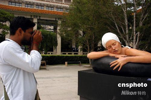 7月8日,“2008·第三届中国北京国际美术双年展”在北京美术馆举行,吸引不少外国游客到来。此次展览有来自81个国家的747件当代绘画和雕塑作品共同展出,展览将持续到8月12日。图为展厅外的参展“模特”栩栩如生,让人难辨真假。中新社发 张双双 摄