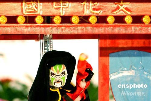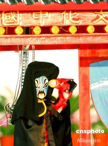 7月17日,苏州碧波实验小学参赛机器人表演“川剧变脸”。当日,在苏州国际博览中心举办的“RoboCup 2008机器人世界杯赛”青少年组机器人跳舞比赛场上,来自苏州碧波实验小学参赛的“川剧变脸机器人”引人入胜。一个身披黑袍的机器人随着川味十足的《唱脸谱》音乐,登台表演2分钟共变换了6张“川剧脸谱”。中新社发 苏秀 摄
