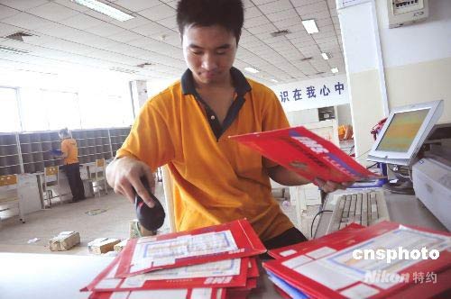 7月18日,河南省南阳市邮政速递局的工作人员在用扫描仪读取高考录取通知书的“电子身份证”,以备输入电脑进行长效监管。 据悉,每份高考录取通知书均被编排了全国唯一的电子信息,由9位数字和4位字母组成,俗称高考录取通知书的“电子身份证”。这即便于速递工作人员在运输、分拣和投递等环节实时跟踪和监控,也便于收件人随时进行查询,以确保高考录取通知书准确快捷地投递。 该局还对高考录取通知书实施单袋单封、本人按址持证签收等措施,保证了每年所投递的5万3千份高考录取通知书无一例出现差错。中新社发 付海厚 摄
