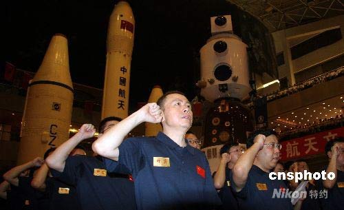 7月19日,伴随着《飞得更高》的激扬乐曲,用于发射“神舟”七号载人飞船的——“长征二号F”运载火箭在中国运载火箭技术研究院举行出征仪式。经过奋力拼搏,“神七”运载火箭“长征二号F”已总装完毕、整装待发,即将奔赴中国酒泉卫星发射中心,执行“神舟”七号载人航天飞行任务。图为“长征二号F”运载火箭总指挥刘宇(前左一)、总设计师荆木春(前左二)和火箭发射队队员一起宣誓出征。中新社发 孙自法 摄