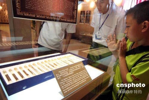 7月23日,北京中国军事博物馆举行的“制胜之道——《孙子兵法》”展上,20片刻有《孙子兵法》的竹简以特殊形态亮相。为保护这些竹简,每片竹简都保存在一个装满药水的密闭管中。据介绍,这些竹简是从3个不同墓坑中发掘的。中新社发 吴芒子 摄