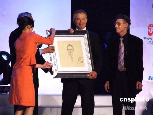 8月4日,由北京大学主办的“2008奥运.冠军论坛”在北京大学百年纪念讲堂内隆重开幕。出席开幕盛典的贵宾有英国前首相托尼.布莱尔、成龙、谭盾、扬扬、罗雪娟在内的数十位中外嘉宾。图为北京大学校长许智宏向英国前首相托尼.布莱尔赠送画像。中新社发 郑雄增 摄
