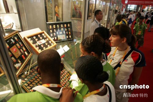8月11日,奥林匹克青年营营员们参观中国嘉德奥运专场拍卖会预展,小营员们在预展的纪念章展台前专注观看。本次拍卖会拍品将包括来自海内外藏家的体育题材的艺术品、奥运邮品、奥运纪念品和收藏品三大门类近300件精品。这次拍卖的重头之一是是以靳尚谊为代表的写实画派所创作的著名奥运人物肖像,其中包括《萨马兰奇》肖像、《罗格》肖像、《女排团体》画像以及1984年至2000年五届奥运会全体中国奥运冠军和著名教练员的肖像。除此以外,多届奥运会传递火炬,签名球、签名衫和与奥运相关的奥运纪念邮册、纪念币、珍贵照片、书籍等众多精品也将亮相上拍。中新社发 杨可佳 摄