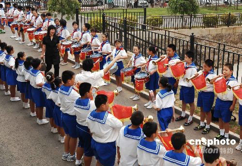9月10日早上,在辽宁省大连市甘井子区金二小学学校门前,鼓乐喧天,学生们将鲜花献给每位老师,表达对老师的节日祝福。当日是我国第24个教师节,各地院校师生开展多种形式的活动,庆贺教师节。中新社发 刘德斌 摄