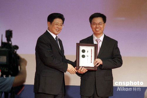 9月17日,中共中央政治局委员、全国人大常委会副委员长王兆国等社会名流为中国科协求是杰出青年成果转化奖获得者颁奖。该奖由全国人大常委会原副委员长、中国科协名誉主席周光召提议,并由中国科协于1998年设立。成果转化奖主要奖励在科技成果转化方面取得优异业绩的青年科技人员,每年奖励名额不超过5名。中新社发 慎重 摄