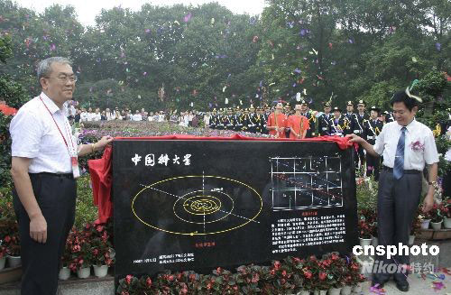 9月20日,在中国科技大学东区郭沫若广场上隆重举行科大五十年校庆日升旗暨“中国科大星”纪念碑揭幕仪式,为学校五十华诞献上第一份祝福。2007年元月,国家天文台研究决定,选定编号为19298这颗于1996年9月20日即科大校庆日发现的小行星命名为“中国科大星”。之前,内地以高等学校名称命名的小行星只有4颗,分别是“北京大学星”、“南京大学星”、“北京师范大学星”和“山东大学星”。图为中科院党组成员、校党委书记郭传杰(左)和龚惠兴院士(右)共同为“中国科大星”纪念碑揭幕。中新社发 张娅子 摄