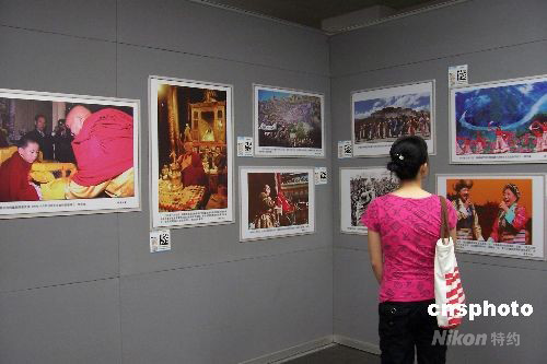 2008年10月7日,西藏今昔大型图片展在上海图书馆免费展出。近200幅图片,生动展现了西藏的昨天和今天,再现了西藏和平解放、民主改革、农奴翻身当家作主等诸多重大历史事件和历史进程,特别是改革开放以来,西藏在经济、文化、社会、人民生活等方面发生的翻天覆地的大变化、大进步。 中新社发 周东潮 摄