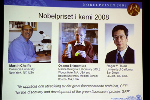 当地时间10月8日11时45分左右(北京时间10月8日17时45分左右),瑞典皇家科学院诺贝尔奖委员会于宣布,将2008年度诺贝尔化学奖授予美国日裔科学家下村修(Osamu Shimomura)、美国科学家马丁·查尔菲(Martin Chalfie),以及美国华裔科学家钱永健。他们三人在发现和研究绿色荧光蛋白(GFP)方面有突出成就。