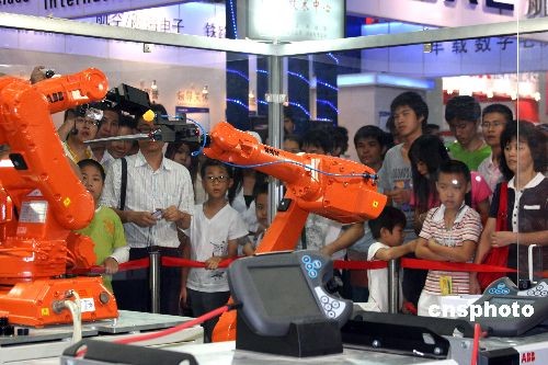 第十届中国国际高新技术成果交易会10月12日在深圳正式开馆迎客。在上届首次设立机器人展备受追捧的基础上,本届高交会机器人专展在展出规模和层次上又有提高,以工业机器人、民生机器人、特种机器人、青少年机器人等多部分展示来自两岸三地,以及日本等国的中外著名大学、研究机构、高科技企业在该领域的成果。图为两台六轴机器人在乒乓球上表演写字“手艺”,吸引着观众。中新社发 凌风 摄