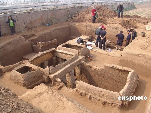 10月15日,考古人员正在挖掘汉墓。近日,在山东省沂南县砖埠镇发现占地约3000平方米的东汉家族墓葬群,经过上级部门批准,考古人员对其中两座墓穴进行了抢救性科学挖掘,目前已经发掘出土8件釉陶壶在内的大量文物,墓内石壁上有多幅画像,清晰可见。中新社发 杜昱葆 摄