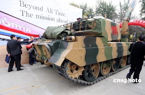 10月28日,一辆军绿色、价值300多万元的“消防坦克”亮相2008北京国际消防设备技术交流展。据悉,消防坦克是由中国军用坦克改装而成的。它采用特种装甲钢板制成,自重大约35吨,装配有直流有线电控自动炮、高压水泵、可燃和有毒气体探测仪及防火直流照明灯,马力很大,最高时速可达70多公里。中新社发 吴芒子 摄