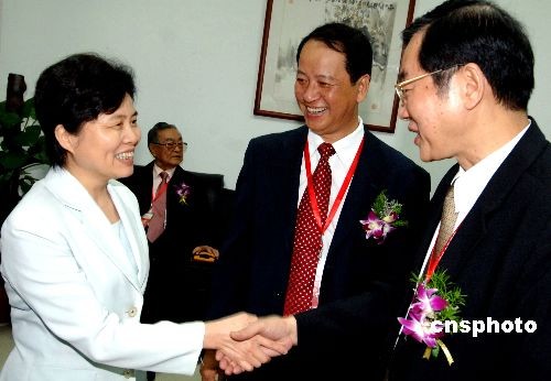 图为出席该学院建校五十周年庆祝大会的中共福建省委常委、福建省副省长兼中共福建省委教育工委书记陈桦(左一)亲切问候台湾中国医药大学校长黄荣村。