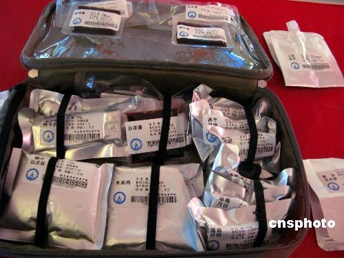 2008年11月19日消息,在北京军博举办的《飞天壮歌——神舟七号载人航天飞行纪实摄影展览》上,展出了由中国航天食品研发中心航天食品研究室研制的神舟七号载人航天飞行员使用的航天食品。中新社发 邹宪 摄