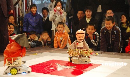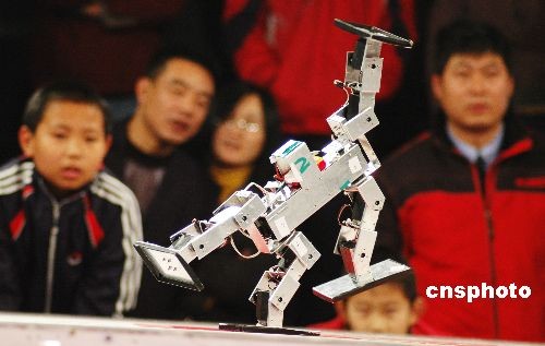12月20日,“2008中国机器人大赛活动在苏州木渎科技创业园举行,来自全国各款顶级版智能机器人纷纷走台亮相。这些机器人可以完成走路、翻滚、伏地挺身及单腿平衡等接近于人体活动的各种动作,吸引了数百名机器人爱好者前来观战。中新社发 朱子寒 摄