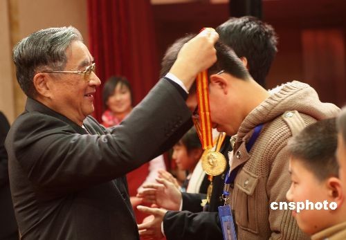 十二月二十一日,第六届“宋庆龄少年儿童发明奖”颁奖仪式在北京举行。中国宋庆龄基金会主席胡启立为获奖者颁奖。中新社发 史利 摄