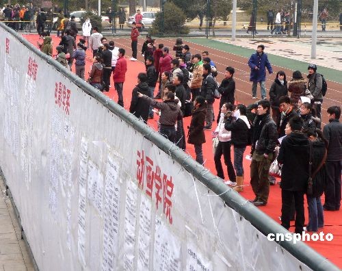 2009年2月17日下午,北京电影学院三试榜单“出炉”,541名考生入围表演学院的最终考试。之前进入复试的1500余名考生及家长纷纷前来看榜,七成复试考生被淘汰。中新社发 玉龙 摄