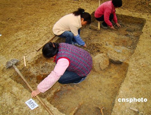 3月4日,成都市文化考古队目前在成都郊区双流华阳发掘出二十六座汉代、唐宋时期古墓。目前该古墓群正在进行先期发掘,已出土了数枚汉代王莽时期用过的“货布”、“货泉”等古钱币。其中汉代早期土坑墓为十座、砖室墓八座;唐、宋时期砖室墓八座。图为工作人员正在对古墓进行发掘。中新社发 王萌 摄
