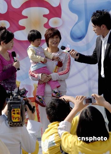 三月十五日,由南方电视台少儿频道主办的“第三届长安宝宝大赛”启动仪式在广东东莞东城文化中心举行。奥运冠军冼东妹与她的女儿参加比赛后接受媒体采访。中新社发 刘卫勇 摄