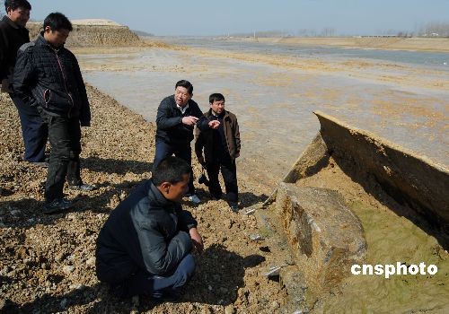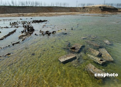 2009年3月25日,在京杭运河山东台儿庄段拍摄到的浮出水面的明朝古运河船闸闸址。近日,一座在水下沉睡了400多年的古水工建筑遗址(古船闸)在京杭运河台儿庄段进行河道疏浚工程时被发现,这座古船闸位于新闸村北古运河中心,船闸东西长约56米,南北约12米,古船闸的木桩繁多,条状块石可见,闸门桩基遗址清晰,据考证船闸修建于明朝万历年间,是明代泇运河上的丁庙船闸,是枣庄段运河(泇运河)的八闸之一,距今400多年。此次古船闸的发现,是继顿庄船闸后的又一重大发现,对古运河枣庄段历史和古水工建筑的研究具有非常重要的价值。中新社发 高启民 摄