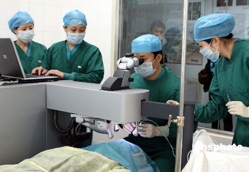 四月八日,中国内地首个免费为汶川灾区考入北京的大学生实施近视眼手术大型公益活动,在二炮总医院正式启动。此次活动面向汶川灾区在二零零八年九月考入北京大专以上全日制大学且患有近视的大学生。中新社发 任海霞 摄