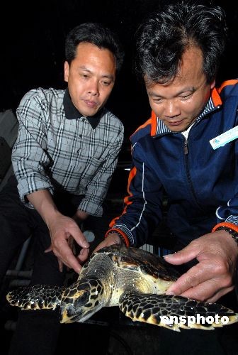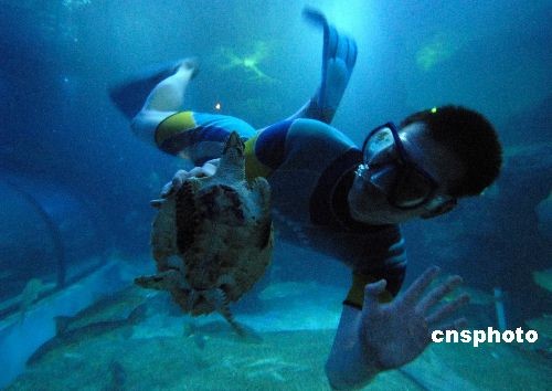4月13日,福州一渔民将其几天前在海边偶然发现的“玳瑁”海龟送进福州左海海底世界。这只“玳瑁”长约12厘米,重约1750克,嘴如鹰嘴,甲壳为褐色,颌缘锯齿状。据饲养员介绍,这只小海龟大约才2岁,还属于“婴儿”状态。“玳瑁”又称十三鳞,属于国家二级保护动物,一般寿命可达1500岁,成年的玳瑁(约20多岁)身长1米,体重40~60公斤,主要生长于热带及亚热带地区的暖水性海洋。该类海龟在中国主要分布于台湾、福建和海南等沿海一带海域。 中新社发 穆长梓 摄