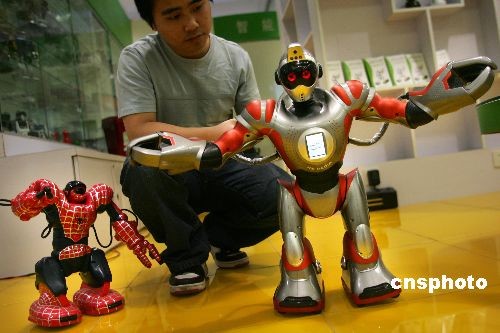 4月15日,北京首家机器人零售商店开业吸引顾客。该店位于中关村一电子商场内。据该店罗经理介绍,他们销售的机器人有近百种,分为保洁型、娱乐型、教学型、家用型,价格从380元至58000元人民币不等。保洁型机器人可每天定时清扫地面,自动躲避障碍物。娱乐型包括有机器人宠物、会跳舞的机器人等。教学型机器人一般用于高校计算机编程方面的教学。家用型机器人相对高端,脸庞分析系统可将陌生人的面容发送到主人手机上,具有“看家”功能,还能通过无线终端设备监测家里老人的血压脉搏等,发现问题会通知主人。中新社发 富田 摄