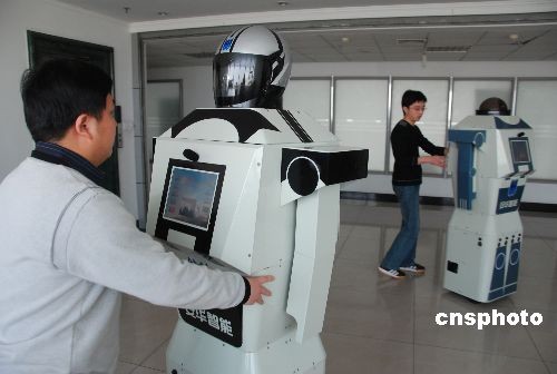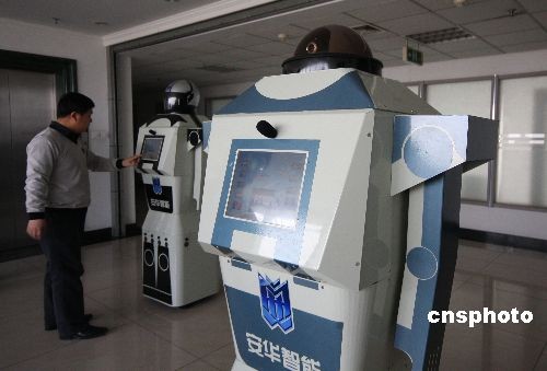 4月18日,潍坊(山东)安华智能公司工作人员展示“团团”“圆圆”智能机器人。由山东安华智能公司自主研发的一男一女两款智能机器人身长分别为170、166厘米、体重各50公斤,男的名叫“团团”,女的名的“圆圆”。他们不但会跳舞,能自主灵活行走,并且具备与人交谈、识别人脸和信息推介等诸多功能。据悉,“团团”“圆圆”将亮相第26届潍坊风筝会,并承担迎宾任务。 中新社发 孙树宝 摄