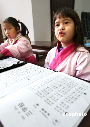 4月25日,生活在北京的中欧混血儿庄润盈身着汉服,在国子监国学馆学堂诵读传统精典《三字经》。近年来,国学已呈现出越来越热的趋势,中外人士焕发出对中国传统文明价值的认同。中新社发 张宇 摄