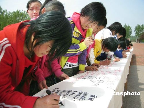 在“五一二”汶川大地震一周年之际,山东省阳信县翟王中学的学生自发举办了以“铭记·力量·明天”为主题的纪念大地震一周年活动。一千二百多名中学生纷纷在长五十一点二米、宽一点五米的长卷上签名留下祝福话语,表达对四川大地震灾区人民的关切之情。中新社发 林世军 摄