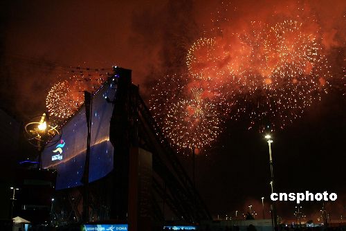 当地时间十二月一日晚,第十五届亚运会在卡塔尔首都多哈开幕。图为仪式结束时燃放的美丽烟花。中新社发 李刚 摄