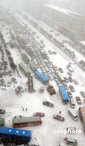 2007年3月4日,沈阳街道上拥堵的汽车。当日,沈阳遭遇暴风雪,交通瘫痪。中新社发 石立飞 摄