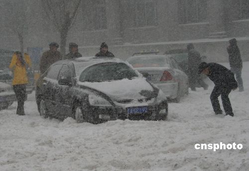 2007年3月4日,沈阳降下多年罕见暴风雪,从清晨到发稿,暴风雪仍未止。市内南关路、五爱街、文艺路上的各种车辆,由于风大雪厚,车辆已不能行驶。中新社发 刘宝成 摄