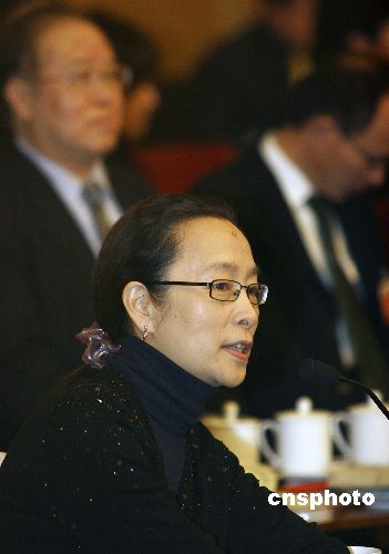 三月七日,十届全国人大五次会议上海代表团在北京人民大会堂上海厅举行全体会议,审议政府工作报告。图为全国人大代表、中国电影家协会副主席、上海话剧艺术中心演员奚美娟。中新社发 刘新 摄