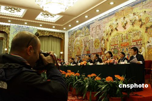 三月八日,参加十届全国人大五次会的西藏代表团在北京人民大会堂就西藏自治区经济社会发展成就等问题接受记者采访,众多中外媒体到场采访。中新社发 刘新 摄