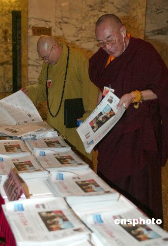 三月九日,全国政协委员那仓向巴昂翁·丹曲成来活佛和全国政协委员圣辉法师在会议驻地翻阅当日报纸,关注全国两会新闻。中新社发 杜洋 摄