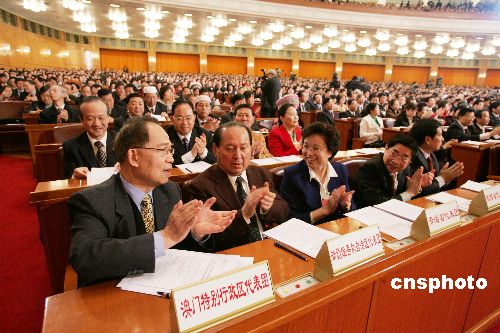 十届全国人大五次会议三月十六日上午在北京人民大会堂闭幕,代表们按表决器通过澳门特别行政区选举第十一届全国人大代表的办法草案。中新社发 毛建军 摄