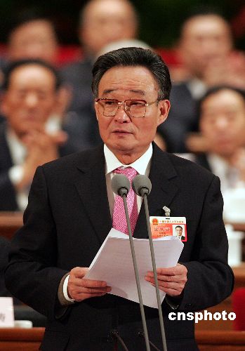十届全国人大五次会议三月十六日上午在北京人民大会堂闭幕,吴邦国委员长主持会议并讲话。中新社发 毛建军 摄