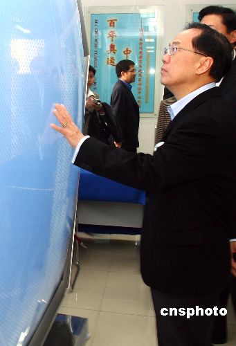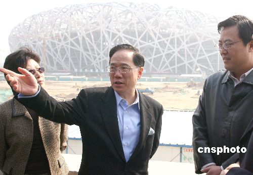 四月十日,香港特别行政区行政长官曾荫权在北京参观北京奥运工程。中新社发 廖文静 摄