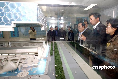 图为曾荫权参观别致的奥运游泳场馆“水立方”模型。