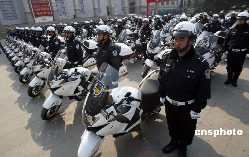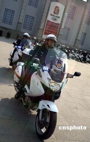 四月十日,北京市公安局公安交通管理局举行长安街交通管理示范街启动仪式,此项活动同时也标志着奥运大练兵的开始。其目的在于把长安街建设成为交通环境一流、管理水平一流、执法能力一流、科技手段一流、警物保障一流、队伍素质一流的交通示范街,以此带动全市的交通管理向更高的目标努力。在创建示范街的过程中,长安街沿线的执勤警员都配备了最新式的摩托车和巡逻警车。中新社发 任海霞 摄